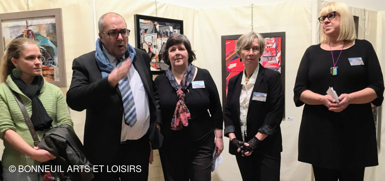 Marie-Aude OINARD (Maire Adjointe Culture) Patrick DOUET ( Maire) - Marithé HUSSON (Présidente) - Esther PRIGENT (Secrétaire) - Fran VIEGAS (invitée D'Honneur - Photo Jean Louis SANCHEZ
